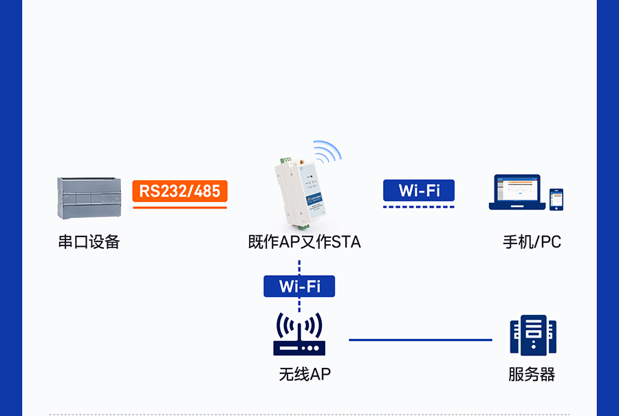 USR-DR404同時開啟無線AP和STA接口,可提供Wi-Fi接入功能和連接其他