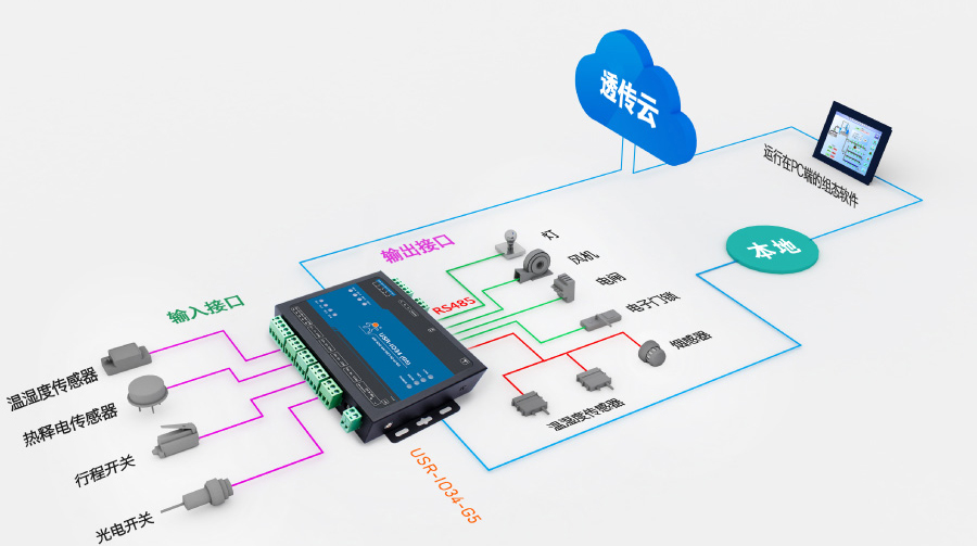 IO控制器可通過輸出接口或RS485級聯(lián)的方式接入被監(jiān)控設(shè)備,通過本地連接或透傳云遠(yuǎn)程監(jiān)控的方式,利用VCOM軟件將網(wǎng)絡(luò)數(shù)據(jù)轉(zhuǎn)換為串口數(shù)據(jù)并發(fā)送至組態(tài)軟件,實現(xiàn)遠(yuǎn)程監(jiān)控。